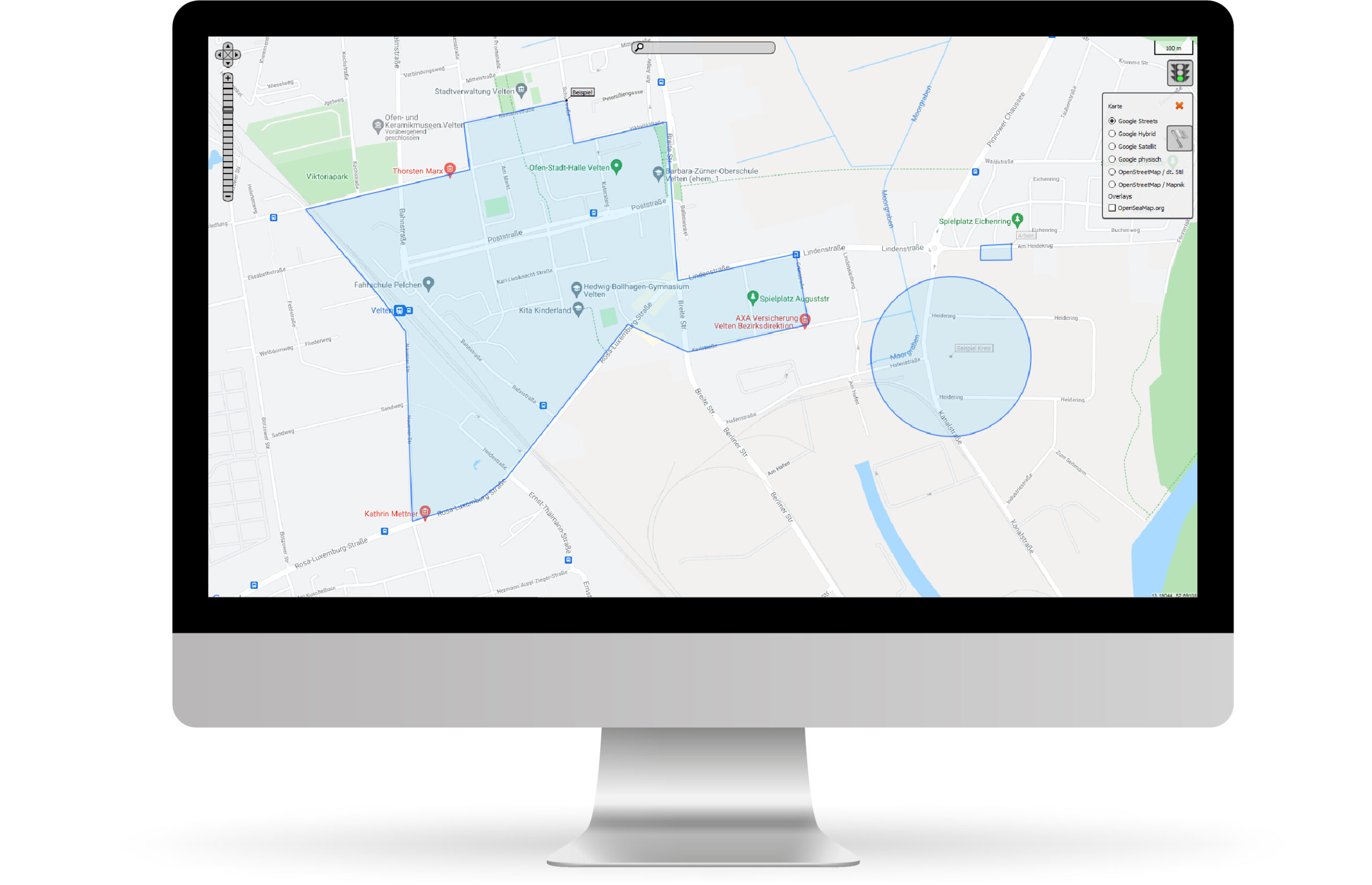 Individuelle Einstellungen ermöglichen eine Vielzahl von Aktionen die ausgelöst werden können. Zum Beispiel: Eines Ihrer Fahrzeuge betritt oder verlässt einen vorher auf der Karte definierten Bereich. Dadurch wird eine Benachrichtigung per Email oder SMS versandt.